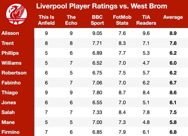 الصحف الإنجليزية وضعت تقييما لكل لاعب من ليفربول أمام وست بروميتش حسب الدرجات من 1 إلى 10.